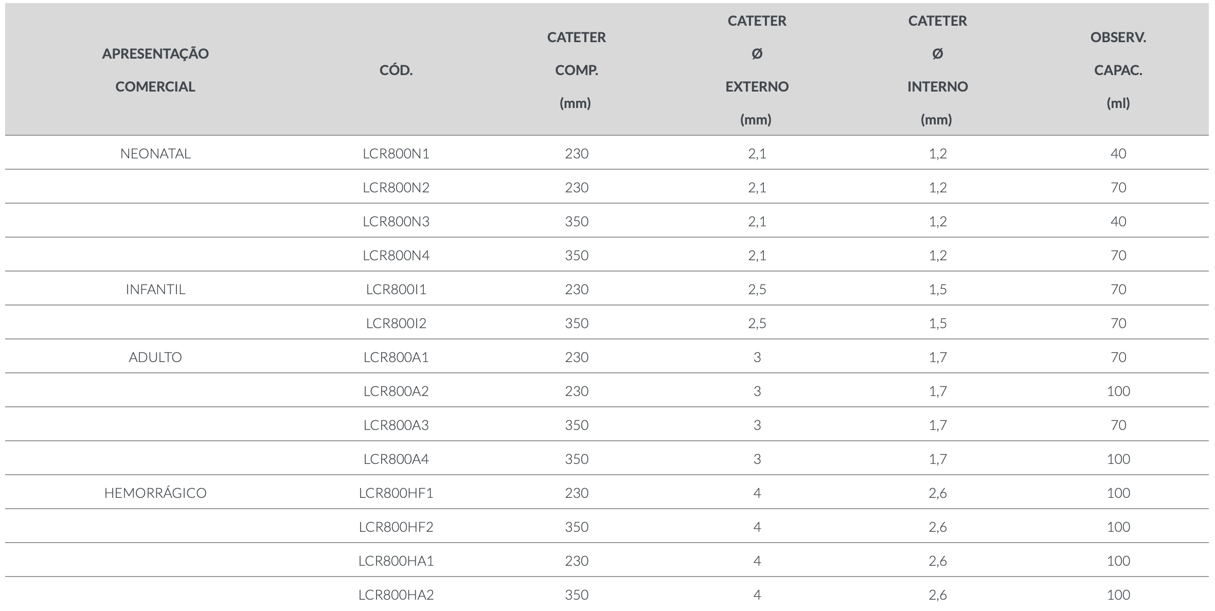 Catéter Ventricular Adulto, Infantil y Neonatal En silicona radiopaca de grado médico, con marcas cada 1 cm hasta la marca de 12 cm. Disponible en tallas 23 y 35 cm.